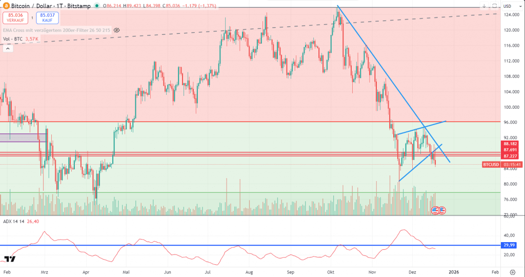 In der technischen Analyse kann ich mich für Bitcoin diesmal kurz halten. Bitcoin ist weiterhin gefangen in seinem Abwärtstrend. Am 15. Dezember verließ er auch die Bärische Flagge, was für eine Trendfortsetzung spricht. Es spricht also jetzt vieles dafür, dass wir schon bald wieder Kurse rund um die 78 000 US-Dollar haben werden, wie bereits im April. Zwar könnte der Kurs nochmals nach oben drehen, bis zu 90.000 US-Dollar, allerdings wäre das nur eine technische Gegenbewegung der bärischen Flagge. Erst bei einem Wochenschlusskurs von 95.000 US-Dollar können wir sicher sein, dass die bärische Flagge ein Fehlsignal war.