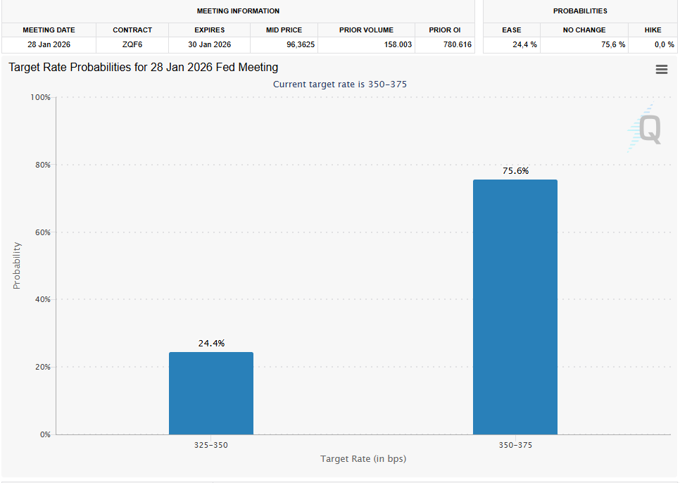 - Die US-Notenbank (FED) hat die Zinssätze gesenkt, was eigentlich positiv für den Bitcoin und Risk-on-Werte ist, allerdings belastet die Unsicherheit, wie es weitergeht, die Kurse eher. Die Datenlage ist weniger klar als üblich, da durch den Shutdown viele relevante Daten fehlen, denn auch das Bureau of Labor Statistics arbeitete in diesen 43 Tagen nur sehr wenig. Powell drückte sich ebenfalls kryptisch aus (kleiner Wortwitz) und dämpfte somit den Risikoappetit der Anleger. Es ist im Moment nicht klar, was schwerer wiegt, der Arbeitsmarkt, oder die Inflation. Deswegen sind sich die meisten auch noch uneinig, wie es weitergeht. Nach dem FedWatch-Tool sehen im Moment 75,6 Prozent keine neue Zinssenkung am 28. Januar (Stand 17.12.2025).