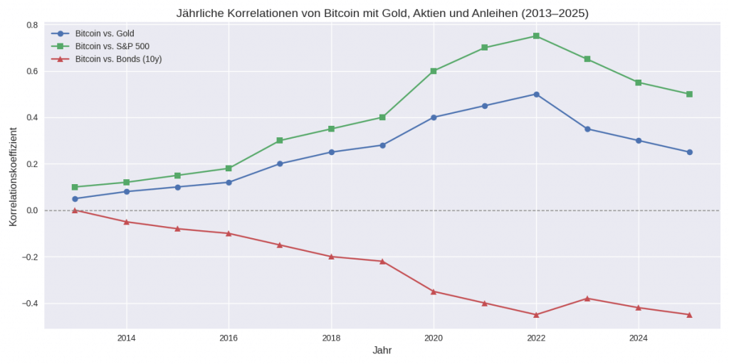 Dieses Diagramm zeigt, wie sich Bitcoin von einem unabhängigen Nischenasset zu einem Risk-on-Asset entwickelt hat, das stark mit Aktien korreliert – während Gold und Bonds ihre klassischen Rollen als Sicherheitsanker behalten.