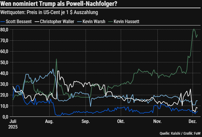 Um gleich bei der FED zu bleiben: Die Frage um die Nachfolge für Jerome Powell kommt langsam in Fahrt. Powells Amtszeit endet im Mai 2026 und im Moment werden mehrere Kandidaten für seine Nachfolge gehandelt, darunter Christopher Waller, Gouverneur der Federal Reserve; Kevin Warsh, ehemaliger Gouverneur; Kevin Hassett, Wirtschaftsberater des Weißen Hauses; und Scott Bessent, Finanzminister von Trump.