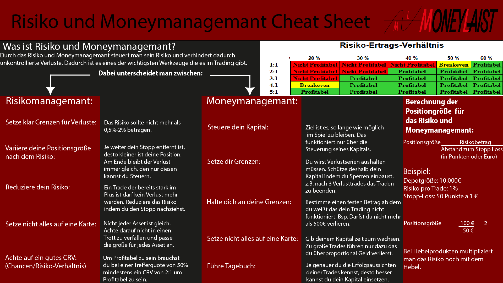 Während sich Moneymanagement mit der gezielten Steuerung des Kapitaleinsatzes beschäftigt. Ziel ist es, so lange wie möglich im Spiel zu bleiben. Je höher also das potenzielle Risiko ist, desto kleiner wird meine Position.