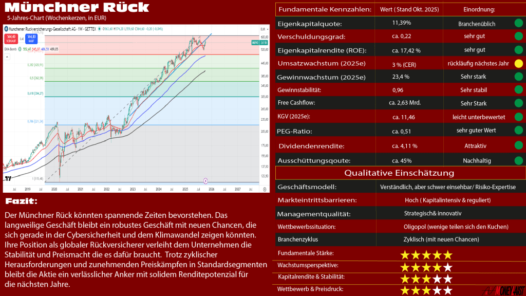Während die europäischen Versicherer teilweise deutlich nach oben gezogen sind, hängt die Münchener Rück etwas hinterher. Allein im September schafften vergleichbare Aktien im Schnitt 4,7 % mehr als die Münchener Rück. Das kann auf eine Unterbewertung hindeuten, das kann aber auch ein erstes Warnzeichen sein. Fundamental scheinen sich andere Werte im Moment besser behaupten zu können als die Münchener Rück. Wir werden das noch genauer bei den Kennzahlen durchleuchten.