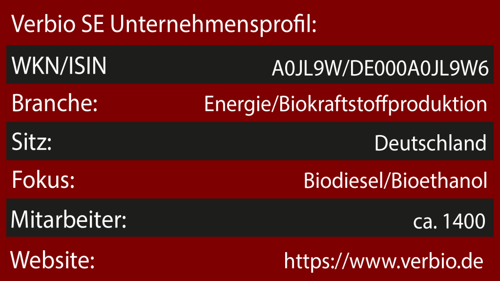 Verbio SE ist ein deutsches Unternehmen, das im Bioenergiesektor tätig ist. Das Unternehmen konzentriert sich auf die Produktion und den Vertrieb von Biokraftstoffen. Dabei ist es in zwei Segmente aufgeteilt. Ein Segment stellt Biodiesel her und das andere Segment konzentriert sich auf Bioethanol und Biomethan. Ein kleines Nebengeschäft hat sich der Konzern durch den Verkauf von Sterolen und pharmazeutischem Glycerin für Konsumgüter und die Kosmetikindustrie aufgebaut. Dazu kommen noch Tierfutter und Düngemittel.