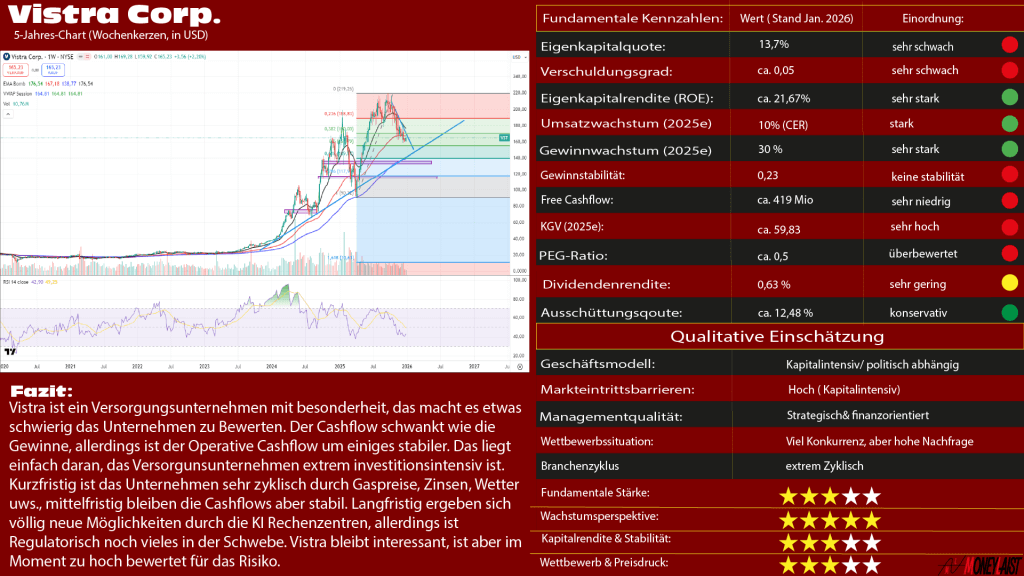 Die Eigenkapitalquote liegt bei 13,7 % und der Verschuldungsgrad bei 0,05. Das zeigt, dass das Unternehmen extrem kapitalintensiv arbeiten muss und sich das Ganze auf die Bilanz auswirkt. In der Branche ist eine hohe Verschuldung zwar durchaus die Regel, aber Vistra Corp. ist selbst im Branchenvergleich im oberen Feld unterwegs.